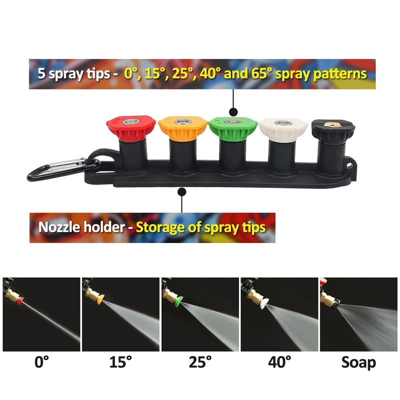 - Multi-angle nozzle: the pressure washer gun has different angle nozzle heads. The nozzles correspond to different colours, such as red (0°), yellow (15°), white (25°), green (40°) and black (65°). Different nozzles for different places. There is always an angle that suits your needs!