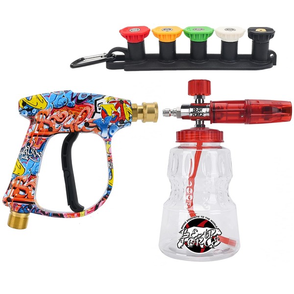 Bear Force 1/4 inch quick release pressure washer snow foam cannon lance gun, 1L bottle, 5 color nozzle tips and adjustable foam lance gun, water gun M22-14mm, perfect for car washing and courtyard cleaning