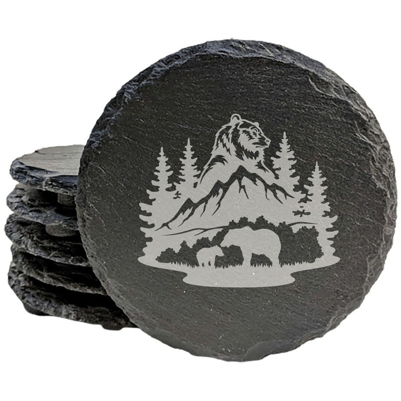 Bear Hug Adventure: Slate Coasters Set, Laser-Etched Male Bear, Mountain & Tree Scene with Mother Bear and Cub - Unique Home Decor Gift - Round Slate - set of 6