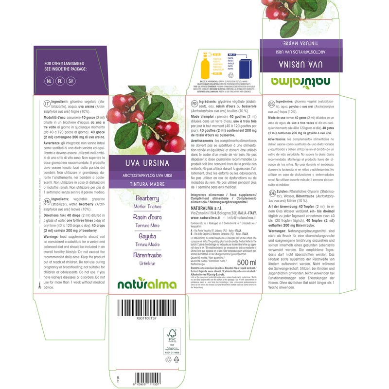 - Bearberry (Arctostaphylos uva ursi) leaves mother tincture concentrated 1:10. 100% natural, alcohol free, no added sugar. Reported to the Italian Ministry of Health. Made in Italy. The dropper is not included in 500 ml format.