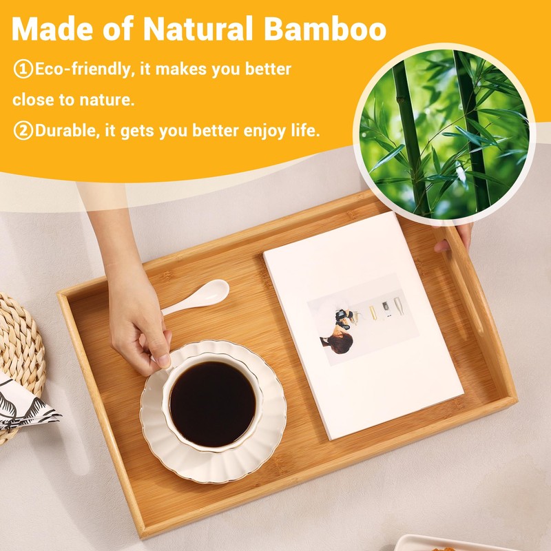 - 𝐍𝐀𝐓𝐔𝐑𝐀𝐋 𝐌𝐀𝐓𝐄𝐑𝐈𝐀𝐋 & 𝐑𝐄𝐈𝐍𝐅𝐎𝐑𝐂𝐄𝐃 𝐃𝐄𝐒𝐈𝐆𝐍 - This bamboo serving tray is meticulously crafted from premium natural bamboo, boasting a surface that has undergone meticulous sanding to reveal its exquisite natural grain. In terms of structural design, the food tray's four corners are reinforced with thickened bamboo, ensuring that even when bearing heavy loads, it remains as stable as a rock, free from any wobbling or shaking. This thoughtful reinforcement allows you for worry-free use.
