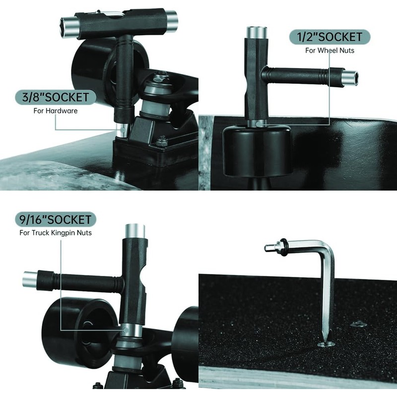 - Slide out Screwdriver w/Allen and Phillips tool, 1/2 Socket for wheels, 9/16 Socket for Trucks, 3/8 Socket for truck mounting Hardware.