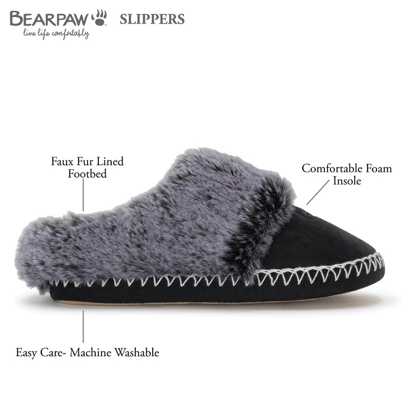LIVE LIFE COMFORTABLY in Bearpaw faux fur lined slippers. Slide on and off easily. Perfect to wear at home. Pair with your Bearpaw pajamas, loungewear, robes, sweatpants, and socks.