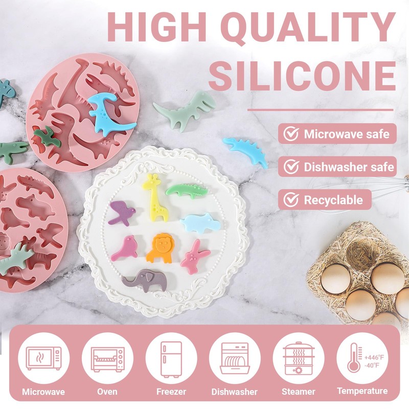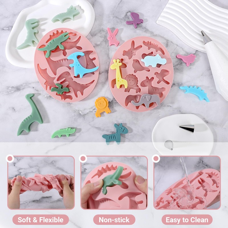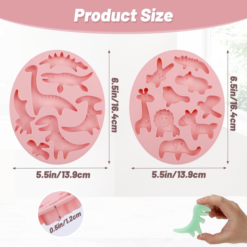 - Package Contents --- This set includes 2 sheets of silicone molds featuring cute animal shapes. One sheet has 7 different dinosaurs, while the other has 9 jungle animals, such as a rabbit, birds, lion, hippo, and more. Please note: These molds are quite small, possibly even tiny. Each animal is perfect for decorating small cakes or cupcakes. To better understand their size, please refer to the size image before making your decision, as they may be much smaller than you expect.