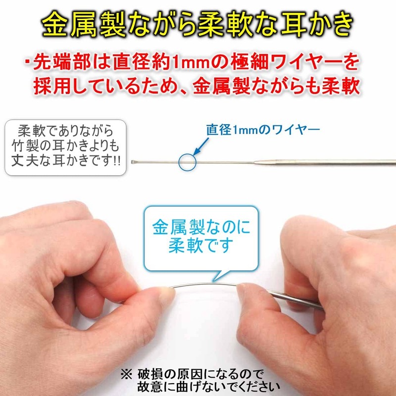 - ✅ステンレス製なのに竹のようにしなる耳かきです。先端部の軸の太さが約1mmと細いため弾力性があり、力を加えるとしなります。一般的な金属製の耳掻きよりも当たりがソフトなみみかきです。