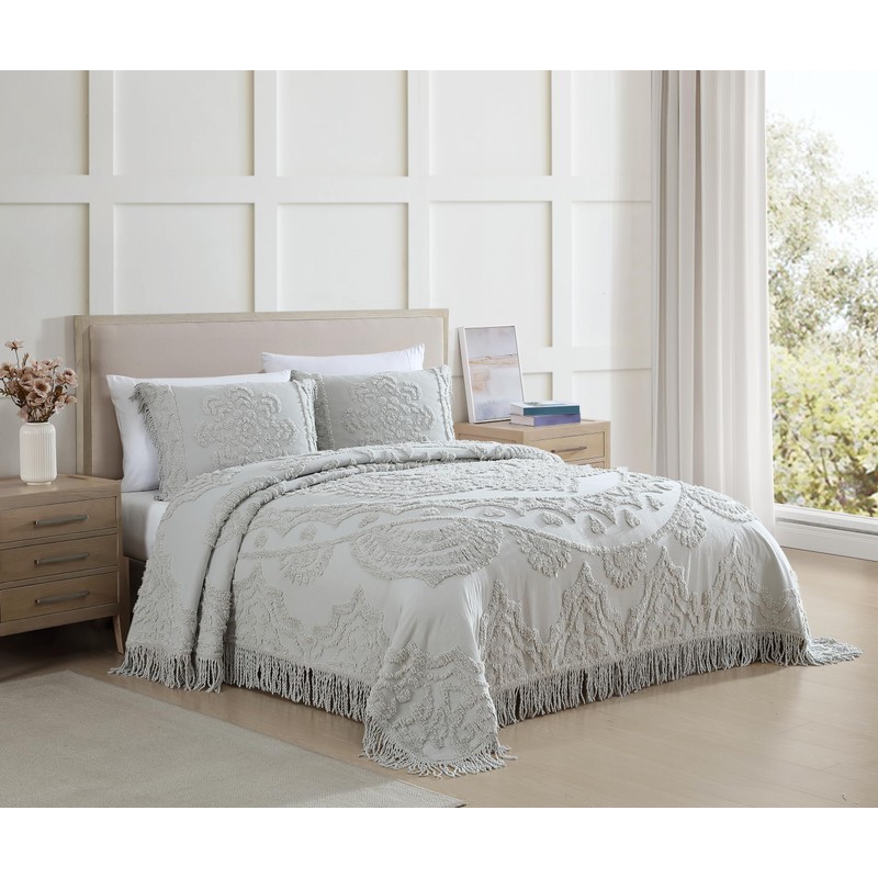 Beatrice Home Fashions Standard Sham, Grey, Lotus Medallion 100% Cotton Chenille, Soft, Cozy, Lightweight, Fringe