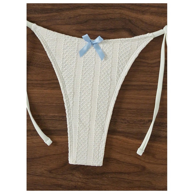 - Design: 2 piece, solid, tie backless, bow front, knot side, high cut, halter, y2k, sexy