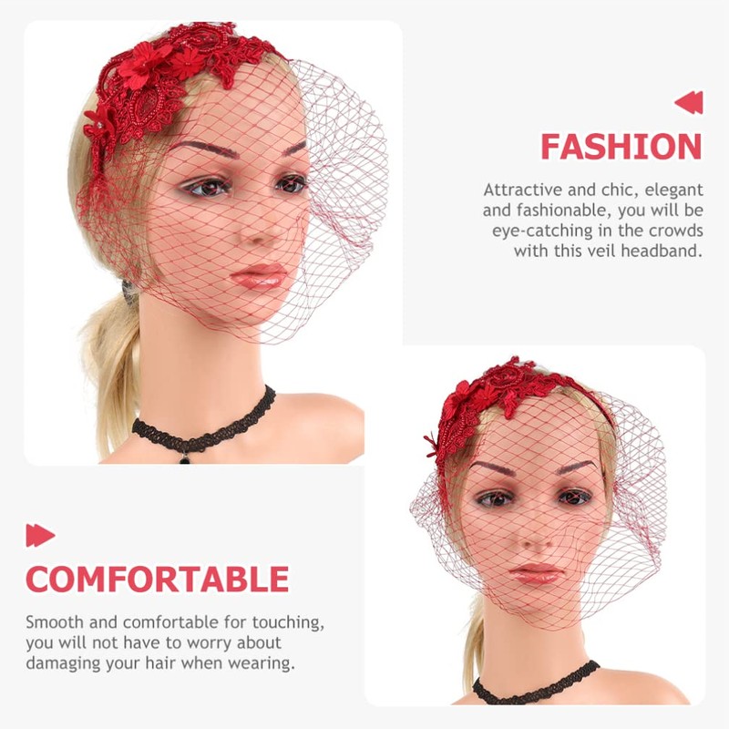Beaupretty Makeup Headband Womens Fascinators Hat Bridal Wedding Veil Mesh Lace Tea Party Headwear Red