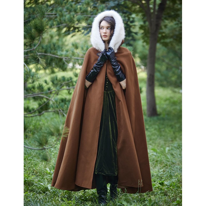 - ELEGENT STYLE WITH ARMS SLITS & OVERSIZED HOOD: This long hooded cape features with Two Arm Slits. Horn button closure adds the perfect touch of vintage to this lovely cloak. The hood of the cape is big enough and with fur trum.