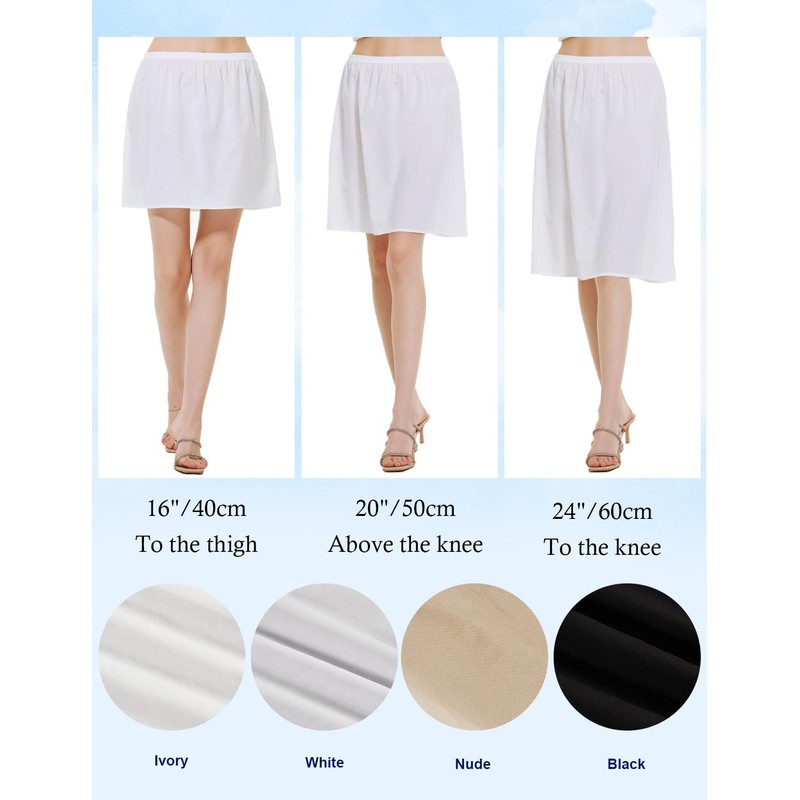 • FITS YOUR DRESS/ SKIRT IN VARIOUS LENGTH --- The length of our cotton skirt slip is available in 5 different length ( 16” 20” 24” 28” 32”). There is always one size for you. Please measure the length of your skirt (from waist to bottom) and then choose the right size.