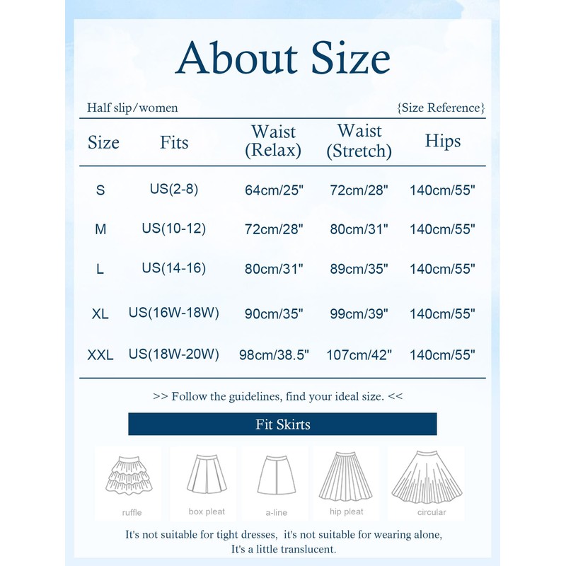 • ELASTIC WAIST FOR COMFORT --- This underskirt has an elastic waist, Size S FITS US SIZE (2-8) accommodates waist measurements from 25" relax to 28.5" stretched. Size M FITS US SIZE (10-12) accommodates waist measurements from 28" relax to 31.5" stretched. Size L FITS US SIZE (14-16) accommodates waist measurements from 31" relax to 35" stretched.