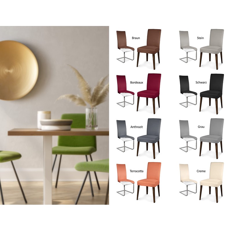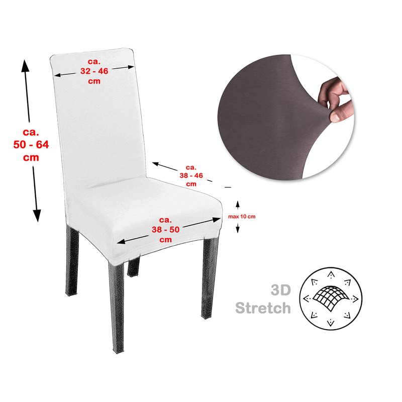 Very easy to clean: machine washable at 30 °C, it can be freshly wound again after drying. Protects the seating furniture and gives it a completely new look. Old chairs look like new again. This universal and wrinkle-free chair cover is characterised by a perfect fit and fits perfectly to any chair. Thanks to the stretch properties (bi-stretch: horizontal and vertical).