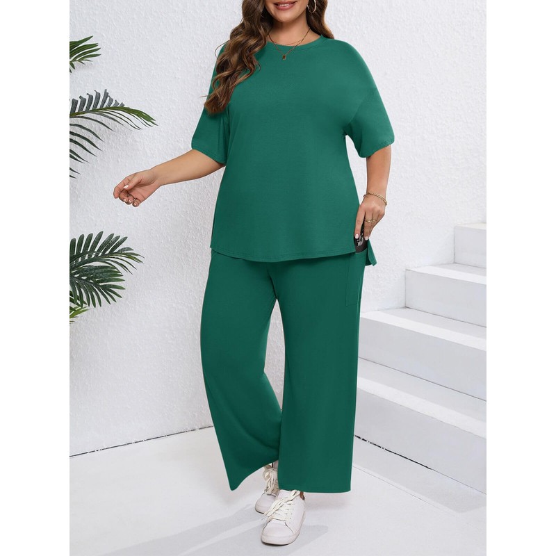 Discover Beautife ultra-comfortable lounge sets for women, thoughtfully designed for plus sizes with premium softness and stretch. Crafted from modal fabric, these sets offer a lightweight, breathable experience that's perfect for all-day wear. The ensemble features a short-sleeved top with a classic crew neck and a flattering side slit detail, while the wide-leg pants boast convenient pockets and a chic high-rise cut, all in timeless solid colors.