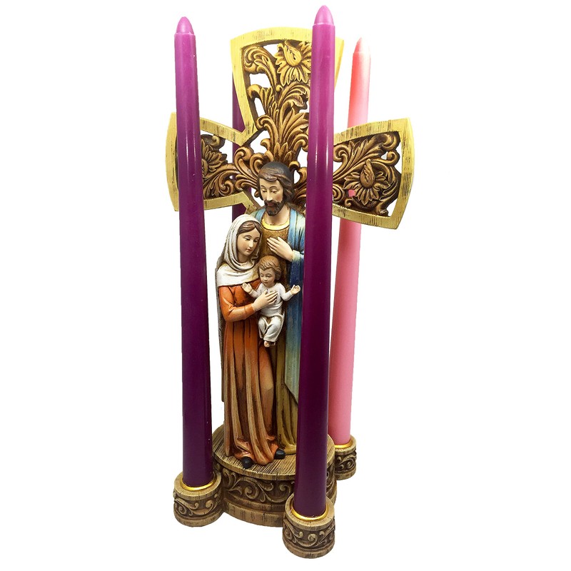 - RELIGIOUS ART PIECE: This beautiful stand alone Tabletop Nativity candle holder designed By Michael Adams has space for four advent candles a depicts a beautiful image of the Holy Family