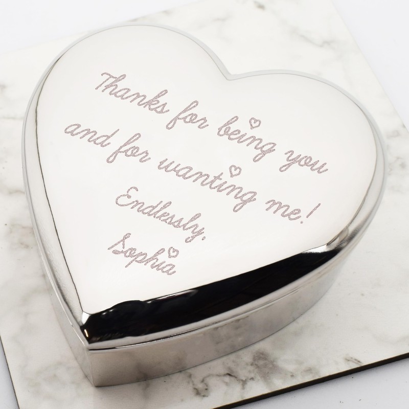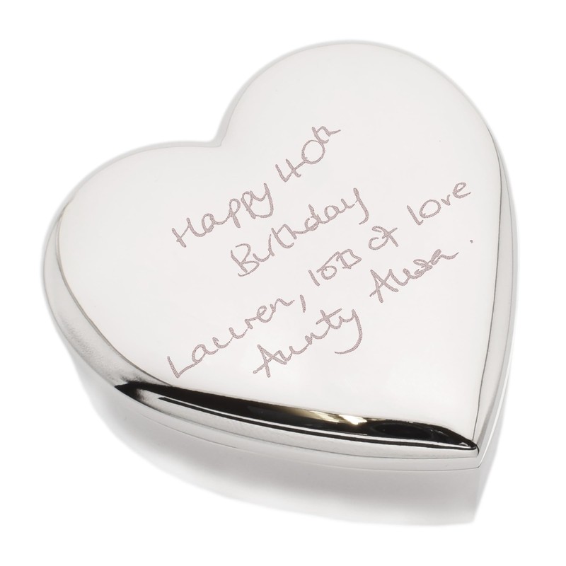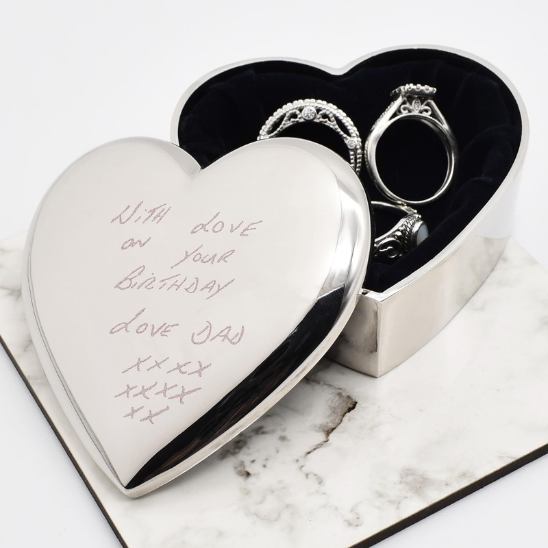 • Personalised Keepsake: Beautifully engraved with your own handwriting on a silver nickle plated heart-shaped trinket box.
