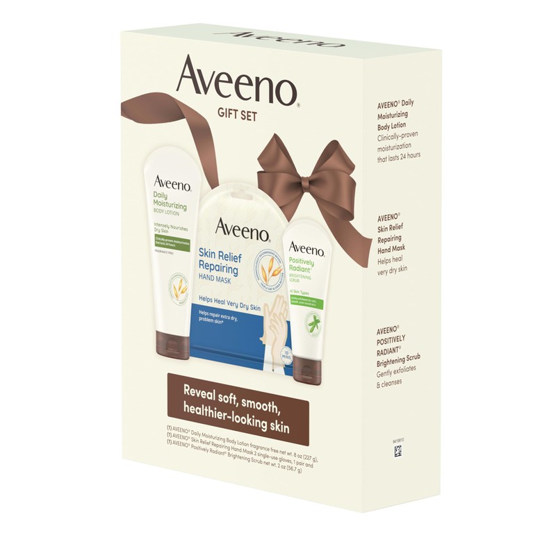 - Exfoliate your dull skin & moisturize your dry skin with this Spa Day Gift Set from Aveeno. This skincare set includes a Positively Radiant Face Scrub, a Daily Moisture Body Lotion & a pair of single-use Skin Relief Hand Masks