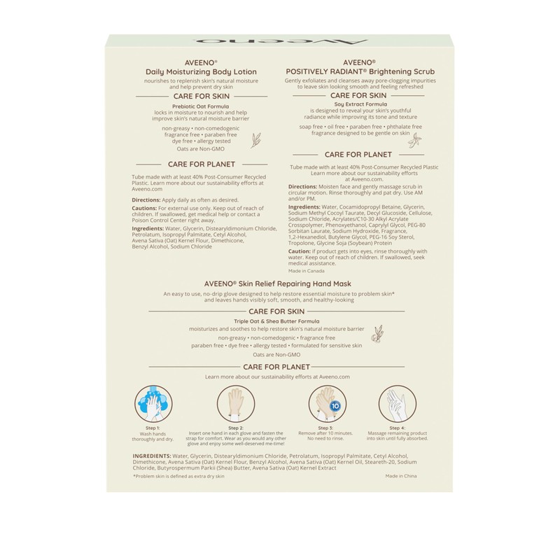 Exfoliate your dull skin & moisturize your dry skin with this Spa Day Gift Set from Aveeno, a dermatologist recommended brand for over 70 years. This skincare set includes a Positively Radiant Face Scrub, a Daily Moisture Body Lotion, & a pair of single-use Skin Relief Hand Masks. The facial scrub leaves skin looking smooth & feeling refreshed. It gently exfoliates skin & helps improve skin's tone & texture & reveals radiant-looking skin. Daily Moisturizing Body Lotion with Prebiotic Oat formula intensely nourishes dry skin. Formulated with a soothing prebiotic oat, the fragrance-free lotion has clinically proven moisturization that lasts 24 hours. The skin relief gloves are enriched with shea butter & moisturizing prebiotic oat to help restore essential moisture to extra-dry skin, leaving your hands visibly soft, smooth, & healthy-looking. These non-comedogenic skincare products are great for everyday or as a part of a relaxing spa day.