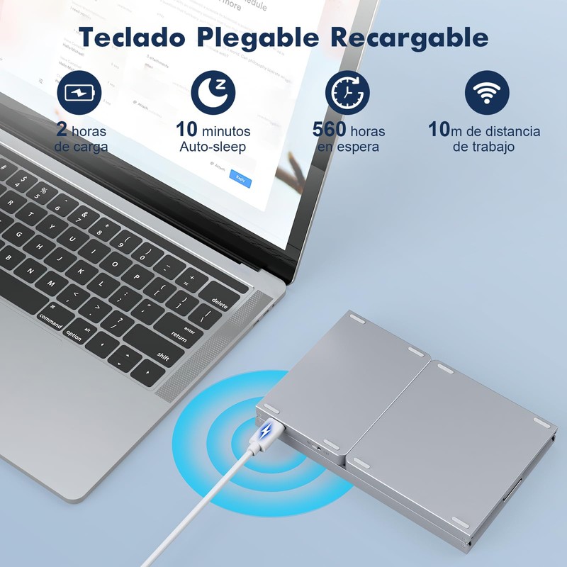 - 【Teclado Portátil Plegable】El teclado inalambrico cuenta con un diseño plegable por tres lados, que permite plegarlo perfectamente, haciendo que todo el teclado sea compacto y ligero.Tamaño plegado de 5.9''x3.9''x0.59'', tamaño desplegado de 13.8''x3.9''x0.31''. El teclado inalámbrico plegable se puede colocar fácilmente en una mochila o bolso, por lo que es cómodo de llevar y adecuado para viajeros de negocios, estudiantes, académicos, profesionales móviles y usuarios de teléfonos inteligentes / tabletas.