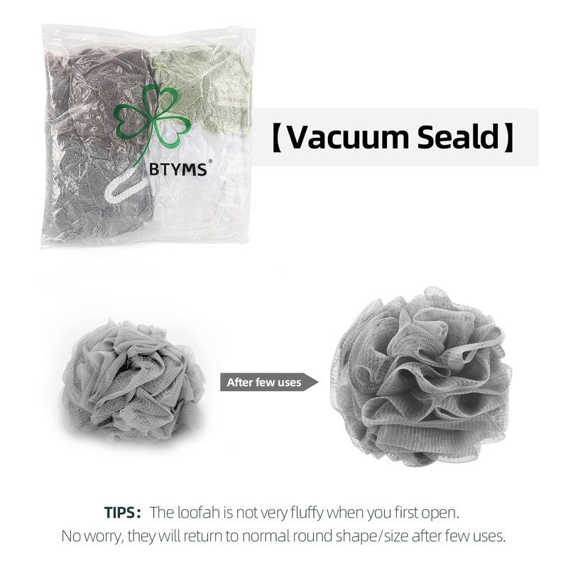 - Vacuum Seald: The loofah is not very fluffy when you first open. No worry, they will back up to normal round shape/size after few uses