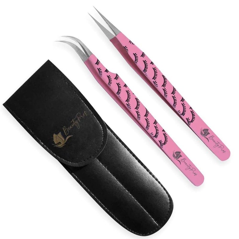 BeautyPros Eyelash Extension Set - Stainless Steel Straight & Curved Tweezers - Classic Tip Tweezers for Volume Eyelash Extension - 2 Pack - Pink Tweezers (Lash Print)