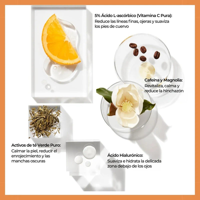 - Hidrata, reafirma y levanta con vitamina C, ácido hialurónico y extracto de té verde, libre de fragancia para reducir las ojeras y la hinchazón, seguro para pieles sensibles Suaviza e hidrata tu piel mientras disminuye la apariencia de líneas y arrugas. Los pies de los cuervos se han ido porque ahora tus ojos estarán refrescados por la textura aterciopelada y sin peso de este suero para los ojos. ¿Tarde en la noche? Alivia el enrojecimiento y la irritación inmediatamente mientras que reemplaza la necesidad de debajo del ocultador de ojos! ¿Cuántas de sus cremas y sueros para los ojos realmente hacen que se sienta más joven y más vibrante con cada aplicación? El nuestro lo hace. Mientras reduce las bolsas de los ojos y las líneas finas, usted consigue la tranquilidad de saber que su nuevo crema para los ojos favorito es seguro, sin fragancia, sin conservantes, sin tinte, sin parabenos y sin ftalato. Tus ojos merecen lo mejor, así que nos esforzamos. Heal & Protect con 5% de vitamina C pura (ácido L