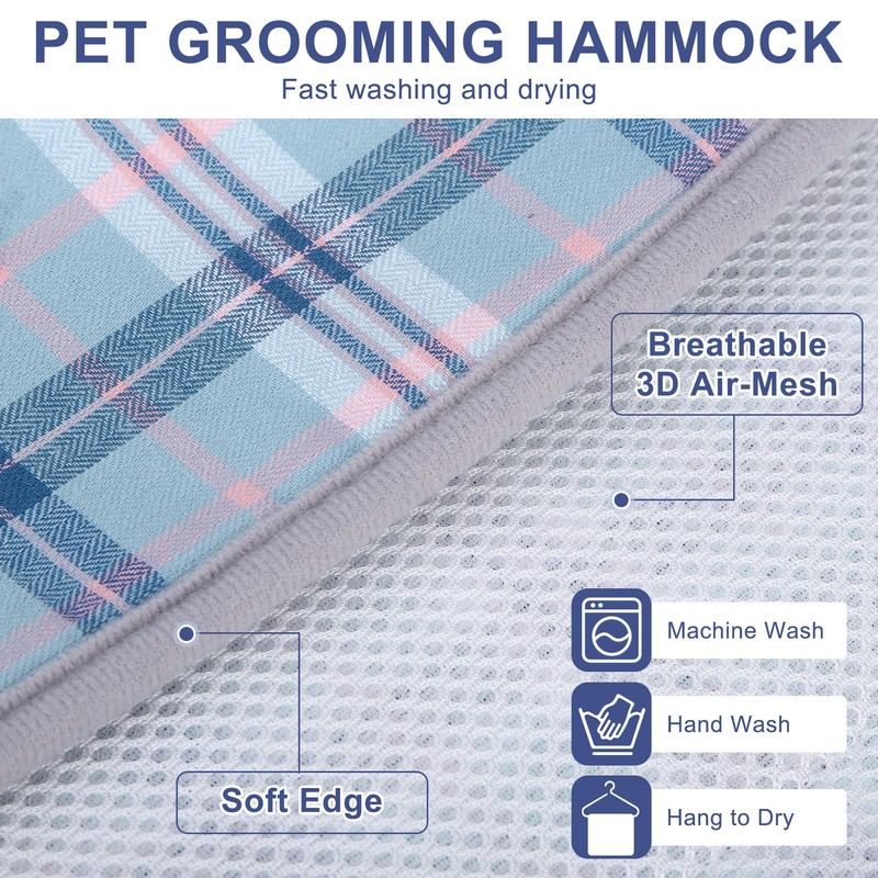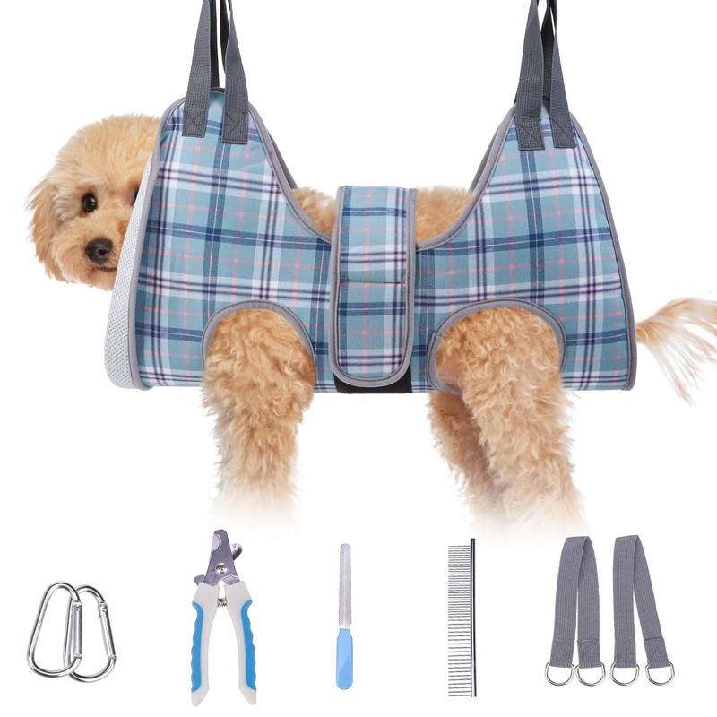- Comfortable and Safe Hanging Dog Harness for Nail Trimming- 3D air mesh with thickened edges makes this pet grooming sling increase breathability and sturdiness. In addition, dog/cat restraint grooming bag has an Upgraded wider under body support & larger frontal chest/neck space, plus more spacious hind leg openings to keep back legs from pinching. Our Heavy-duty carabiners with better weight bearing, and are more durable secure than other S-hooks