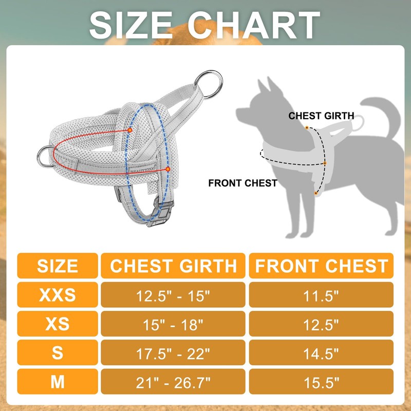 - Choose the Suitable Dog Harness: No pull dog harness have FOUR sizes. Medium dog harness is designed for medium sized dogs. Medium: front chest 15.5"(unadjustable),belly chest 21-26.7". NOT directly correspond to your pet's breed or weight. MEASURE YOUR DOG'S SIZE carefully before order. If any confusion of the measurements are between two sizes, please choose the LARGER size