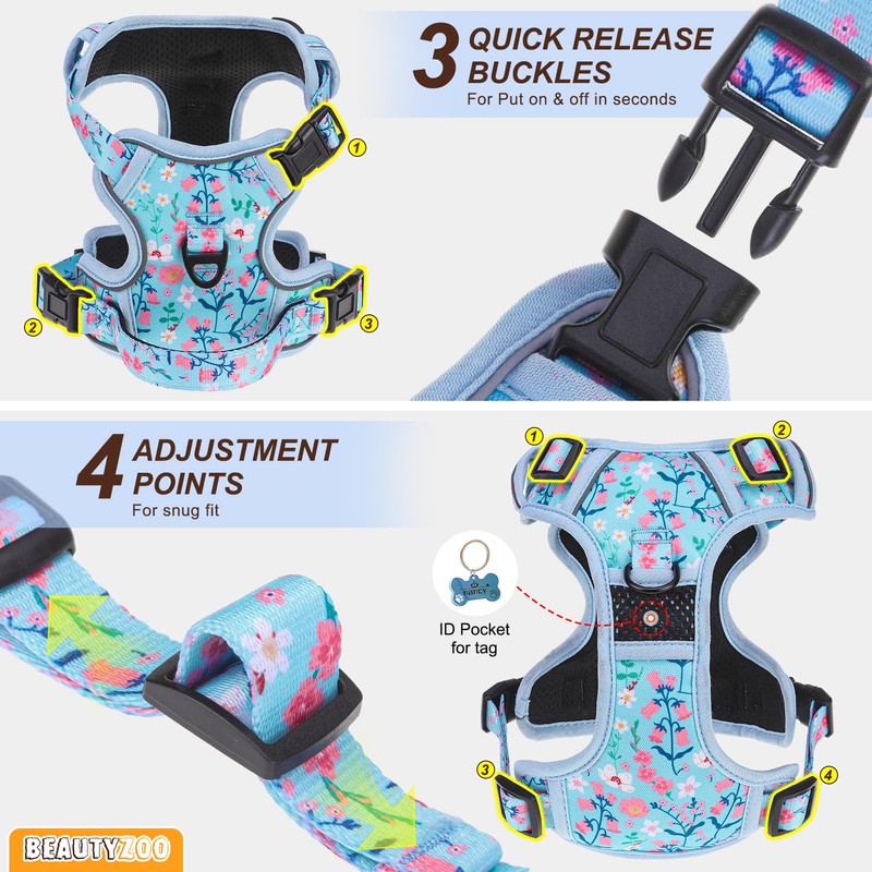 - CUSTOM FIT - With 4 adjustable points, this harness provides a snug, comfortable fit and room for growth. The quick-release buckles make it easy to put on and take off. For added comfort, ensure there’s enough room for 2 fingers between the harness and your dog’s body.