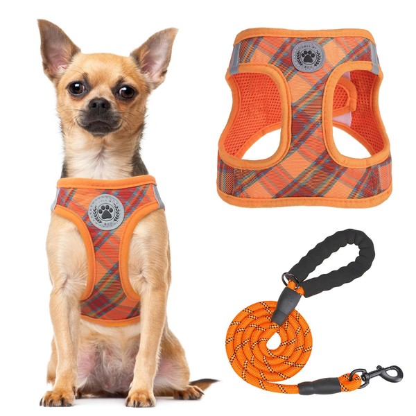 BEAUTYZOO Step in Dog Harness and Leash Set, Reflective Dog Harness No Pull No Choke Puppy Harness for Extra Small Dogs Cats, Soft Padded Mesh Vest Harnesses for Girl and Boy Pets, Orange Plaid XS
