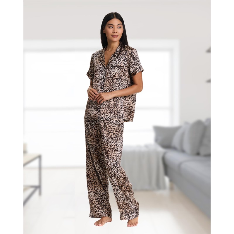 bebe Women's Silky Satin Bridesmaid Pajama Set – Button Down Short Sleeve Sleepwear in Luxe Patterns, Warm Taupe, Large
