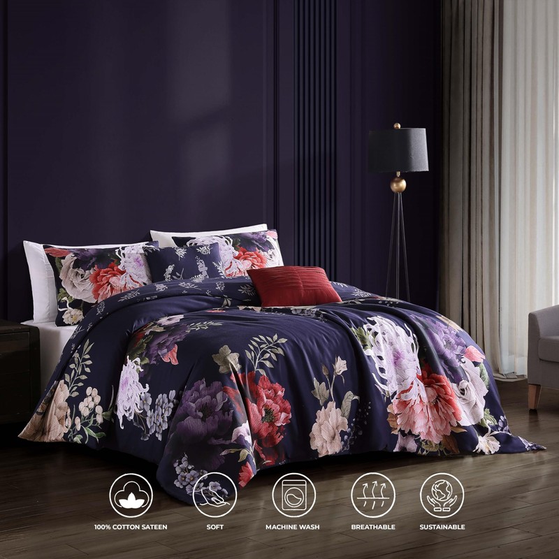 Bebejan Deep Purple Garden 100% Cotton 5 Piece Comforter Set, Floral Printed Pattern, 100 Cotton Bedding Comforter Sets for All Seasons, Reversible, 1 Comforter, 2 Shams, 2 Pillows (Full/Queen)