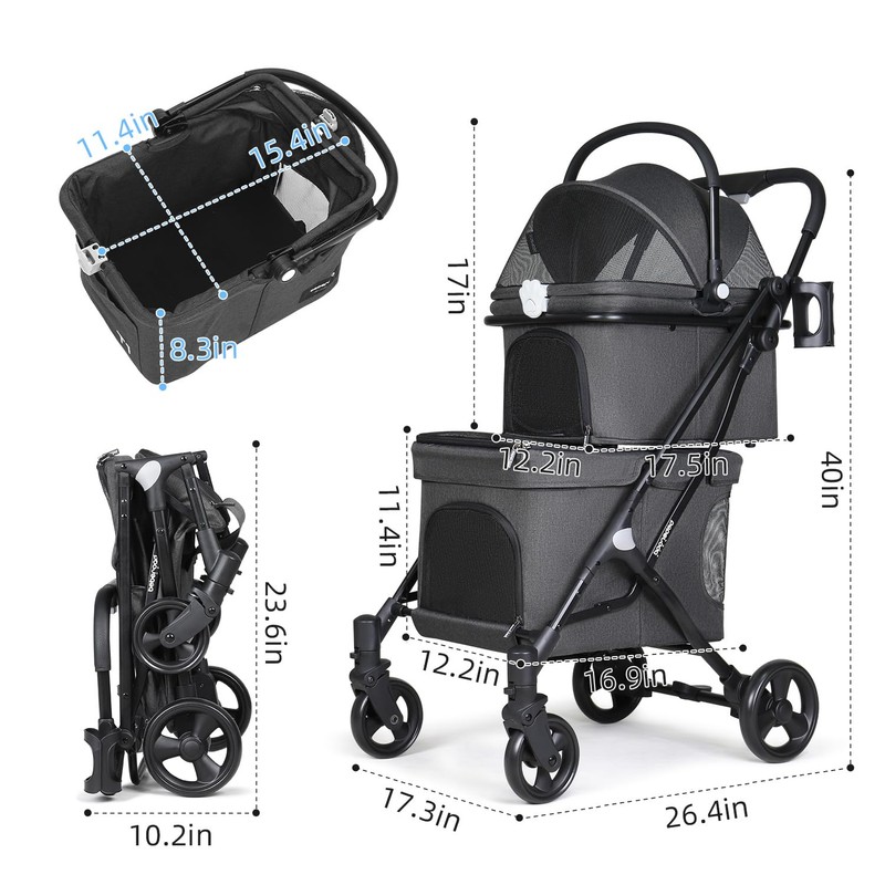 - Portability and storage space: double-decker pet carts can be folded and unfolded with a single click for easy storage and portability. They can be quickly folded into a compact size for easy placement in the trunk of the vehicle or indoors. In addition, double-decker pet carts are equipped with additional storage pockets or cup holders for pet owners to store necessary items.
