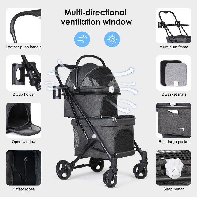 - Double-decker design: The Beberoa Pets T1 double pet stroller features an innovative double-decker design that offers more space and more flexibility. Pet owners can carry multiple pets in the top and bottom layers at the same time or separate pets in different layers to ensure their safety and comfort.