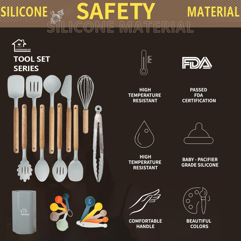 - 19 Durable Wooden Handel Kitchen Utensils Set: Anti scalding protect your hand from burning, 19 professional silicon Kitchen utensil set includeshe set includes 4 sizes knife, Spoon, Spaghetti Scratch,Tongs,Slotted Turner, Brush,Whistle,Scissors and more. Meet your all kinds of kitchen needs, Because of the wooden handle, We don't recommend soaking in water for a long time or dishwasher cleaning