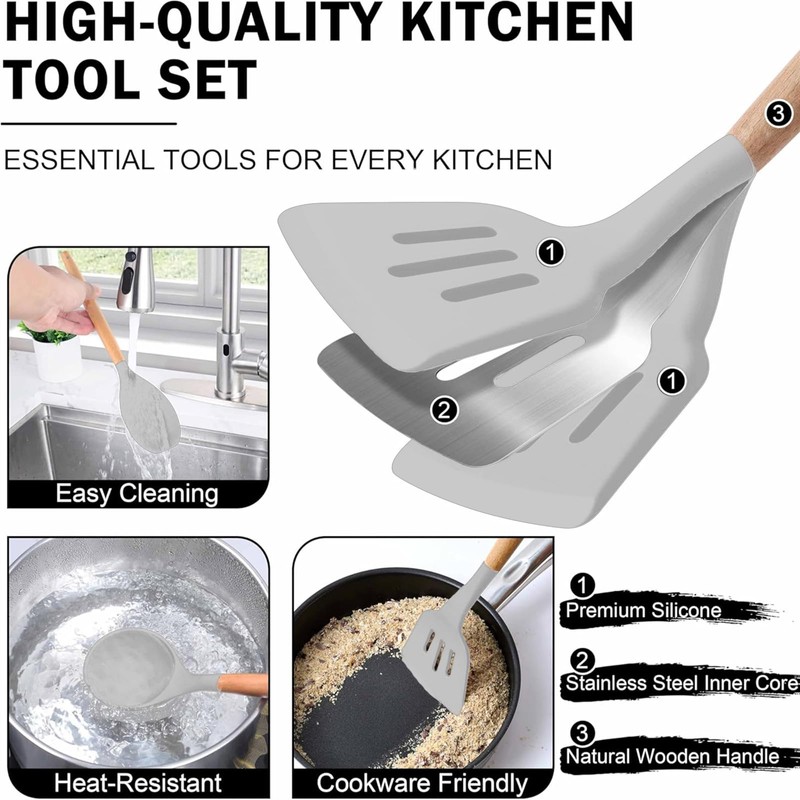 Bebiger Kitchen Cooking Utensils Set, 19 pcs Non-Stick Silicone Cooking Kitchen Utensils Spatula Set with Holder, Wooden Handle Silicone Kitchen Gadgets Utensil Set, Grey