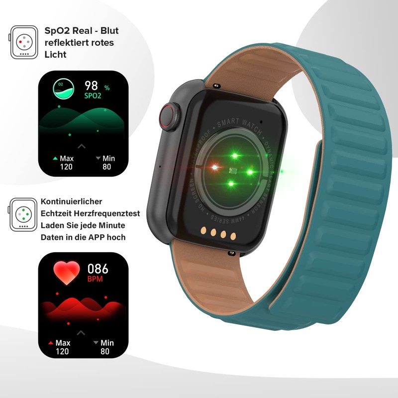 - 【Gesundheits- und Fitnessüberwachung】 Kontinuierliche 24/7 Herzfrequenzüberwachung. Durch einen speziellen Infrarotsensor kann diese Smartwatch die tatsächliche Menge an Sauerstoff in Ihrem Blut erkennen und automatisch Ihren Schlaf überwachen, was Ihnen hilft, Zeiten des Wachseins, Schlafs zu messen. Es erfasst Ihre täglichen Aktivitätsdaten wie Schritte, Kalorien und Entfernung. Unterstützt 28 Sportmodi.