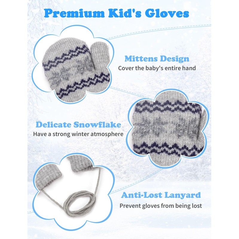 Becellen Mittens Toddler, Warm Thick Baby Knitted Gloves with Lanyard, Cute Snowflakes, Winter Gloves for 0-3 Years, Boys and Girls, gray