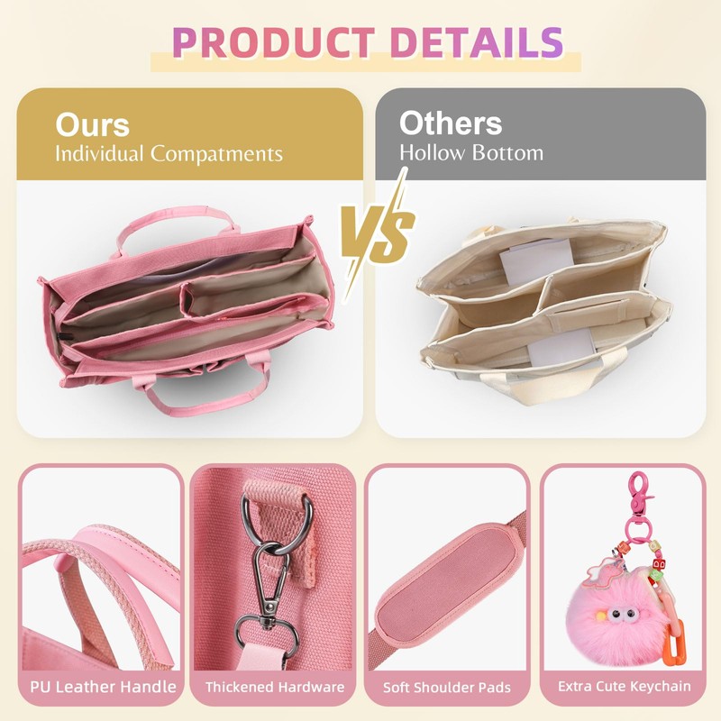 - Multiple Organized Compartments: our canvas tote bag features several individual pockets with sewn-in dividers that stay in place, keeping your essentials neatly organized and preventing items from sliding around