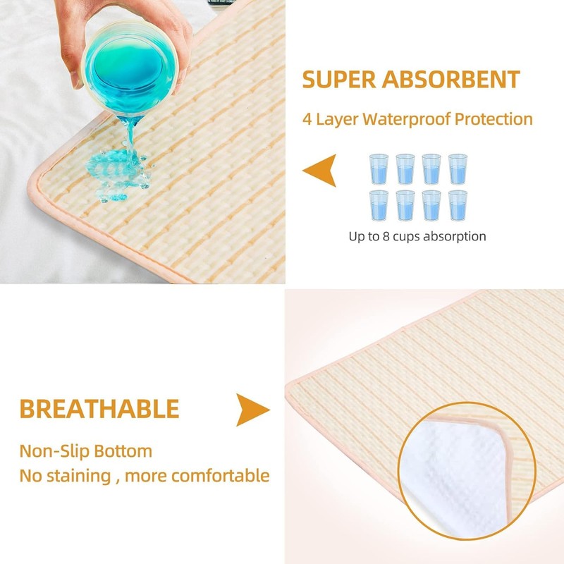 - Superior Absorption: This incontinence bed pads has four layers of protection can quickly absorb and lock in moisture, the first layer is a cotton surface layer, soft to the touch, and skin-friendly. The second is a breathable and absorbent layer, with excellent water absorption and breathability. The third is the TPC waterproof layer, which further prevents liquid from penetrating the pad and wetting the sheets. The fourth layer is bamboo fiber, with good anti-slip effect.