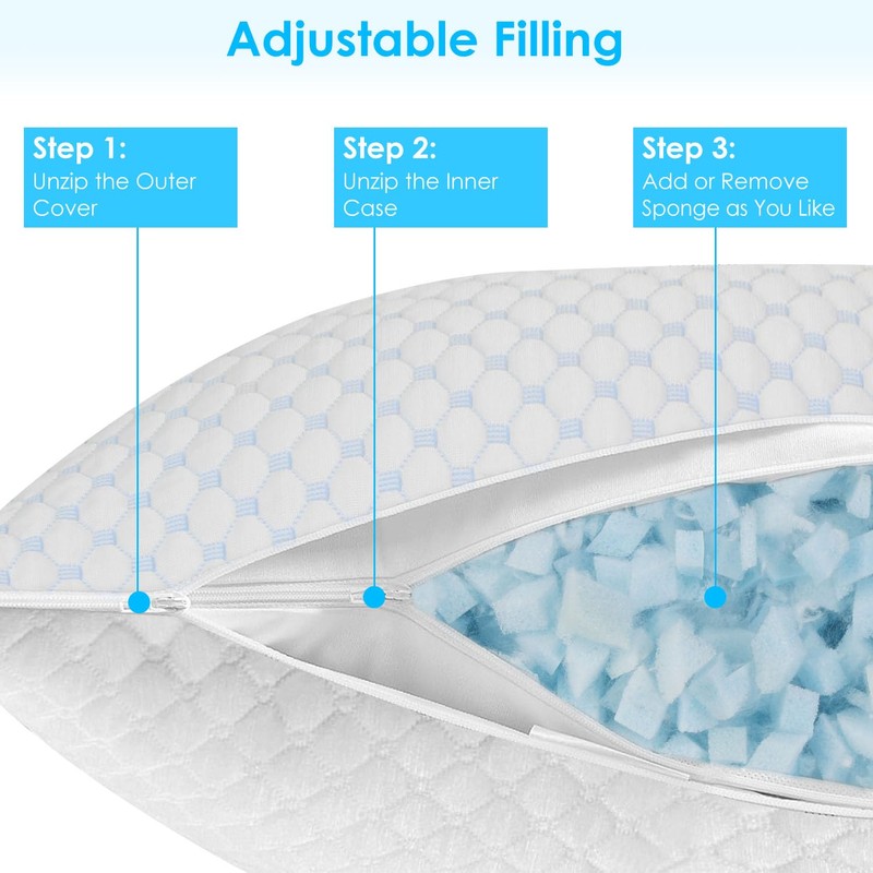 - Adjustable Filling For All Sleepers: Filled with gel infused blue memory foam sponge, the cooling bed pillow provides personalized support to your head, neck and shoulders, relieving pain and enhancing your sleep, whether you're a side sleeper, stomach sleeper, or back sleeper. We also provide an extra bag of sponge, allowing you to customize the filling to suit your size, shape, or sleep position.