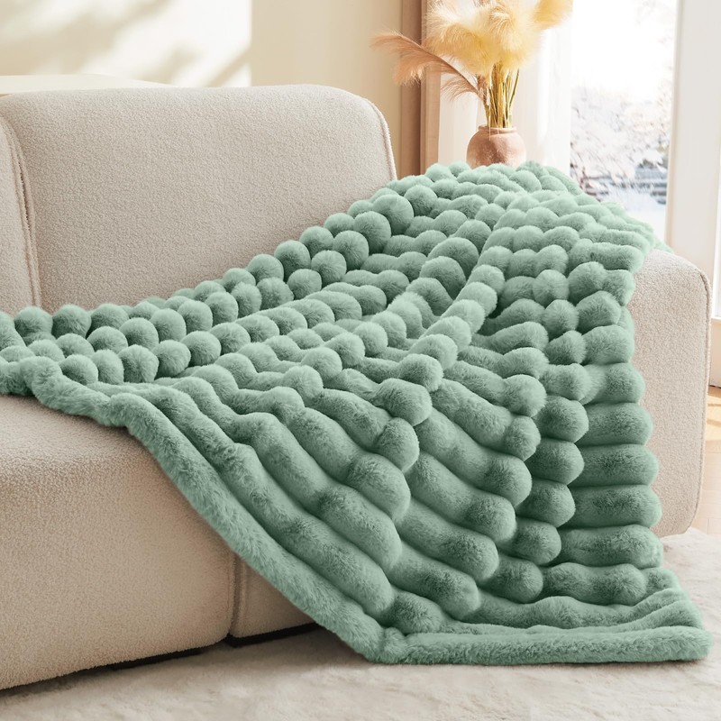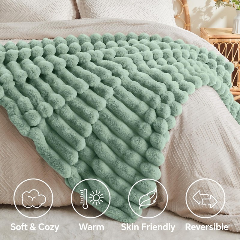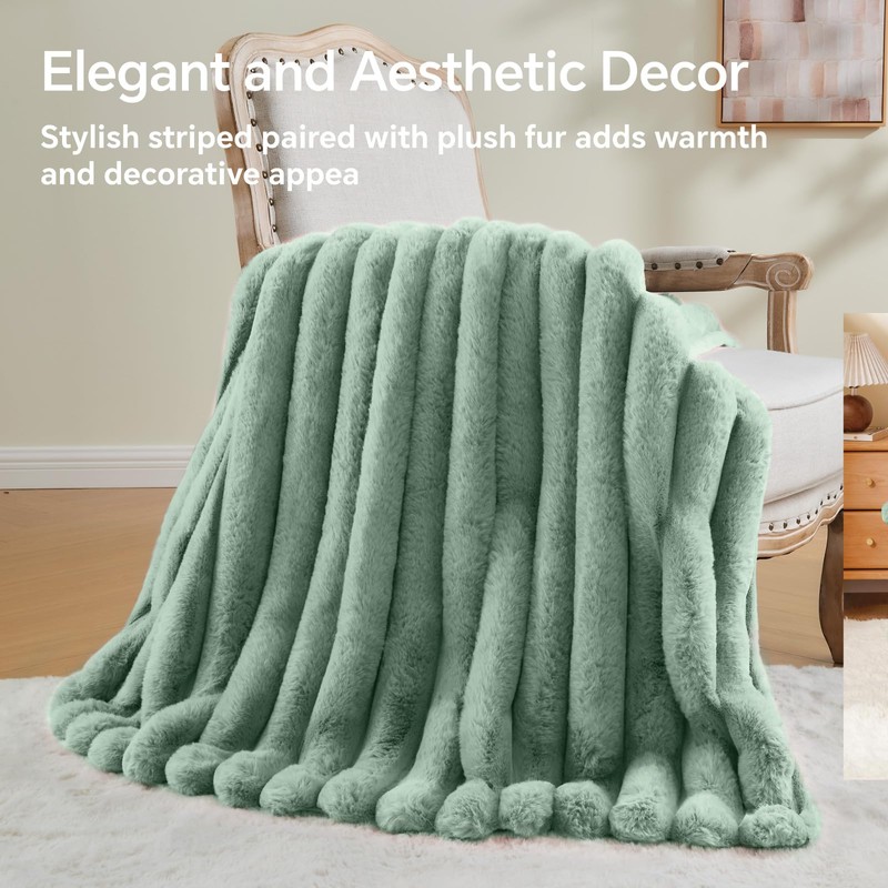 BEDELITE Faux Rabbit Fur Blanket, Luxurious 3D Striped Spring Blanket for Decor & Gift, Soft and Warm Plush Fluffy Faux Fur Throw Blanket All Seasons Suitable, (Sage Green, 60"x 80")