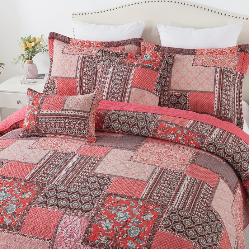 - [Cotton Made] Made with high-quality cotton filling, this queen size quilt set is durable, soft, and breathable, promoting optimal sleep quality. The three-layer structure is tightly stitched, ensuring long-lasting use and ultimate comfort.