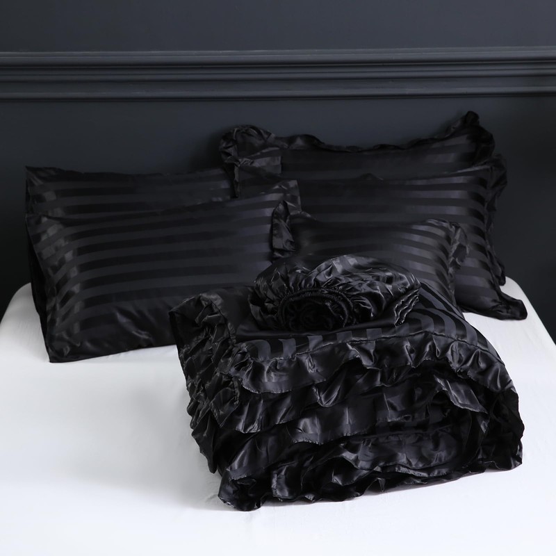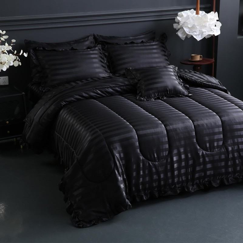 Bedorm Black Stripe Comforter Set 6 Pcs Satin Queen Comforter Black Lace Ruffle Bedding Silk Like Silky Comforter Sets with Sheets Soft Cozy Satin Bed in A Bag