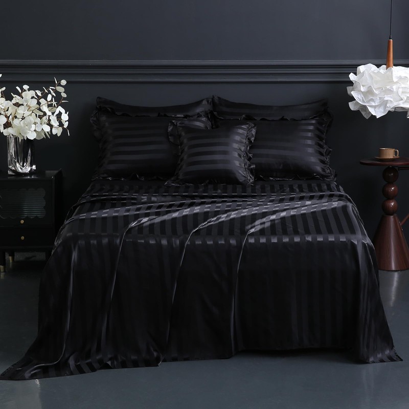 Bedorm Black Stripe Comforter Set 6 Pcs Satin Queen Comforter Black Lace Ruffle Bedding Silk Like Silky Comforter Sets with Sheets Soft Cozy Satin Bed in A Bag