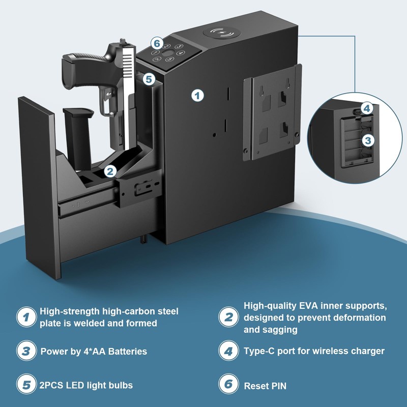 • 🔋【Qi-Certified 20W Wireless Charging】- This gun lock box features a 20W PD fast wireless charging for iPhone & Samsung, smartwatch, earbuds. NOTE: Comes with external charger & Type-C cable (for wireless charging only). Unlock requires 4xAA batteries (NOT included, NOT used for charging)