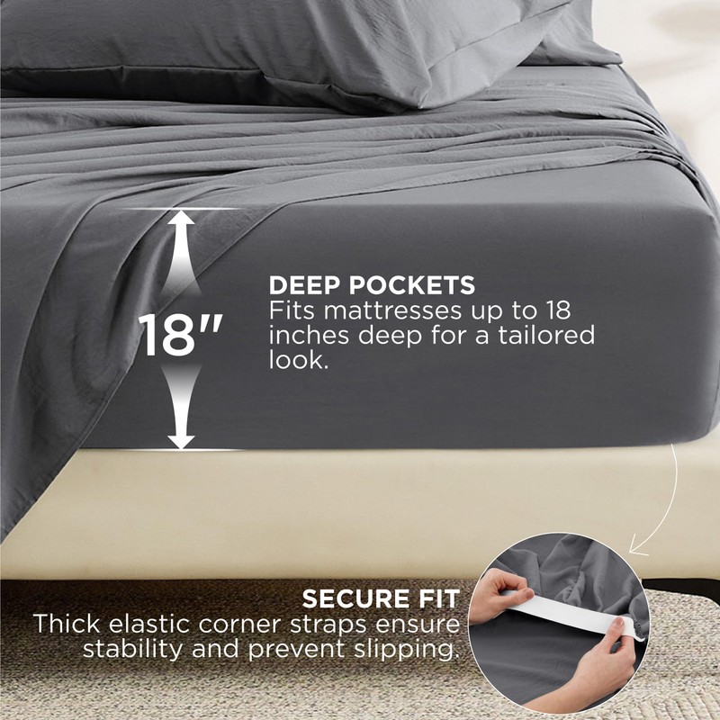 - Extra Deep Pocket Sheet Set: Thick 1.2-inch elastic corner straps and 18 inch deep pockets ensure a secure fit for most mattresses and toppers, while a side pocket provides convenient storage for your essentials.