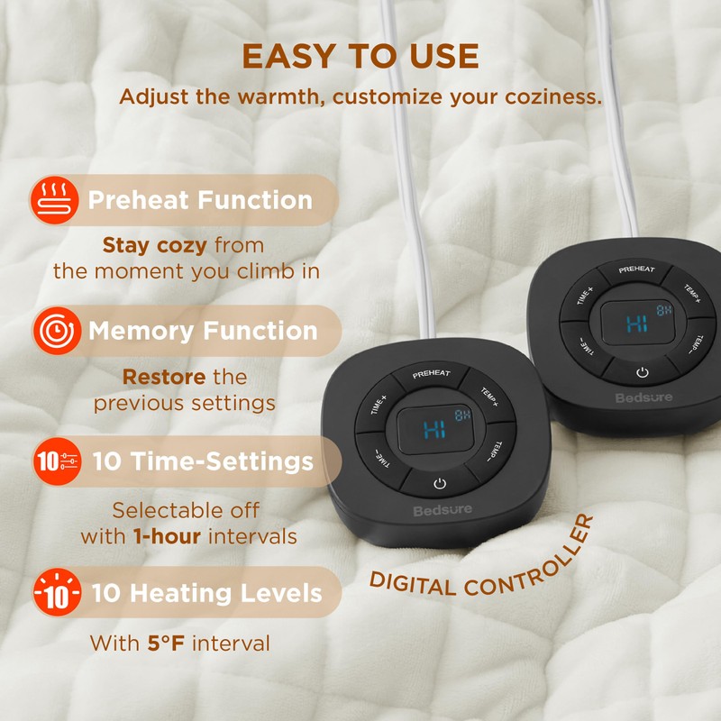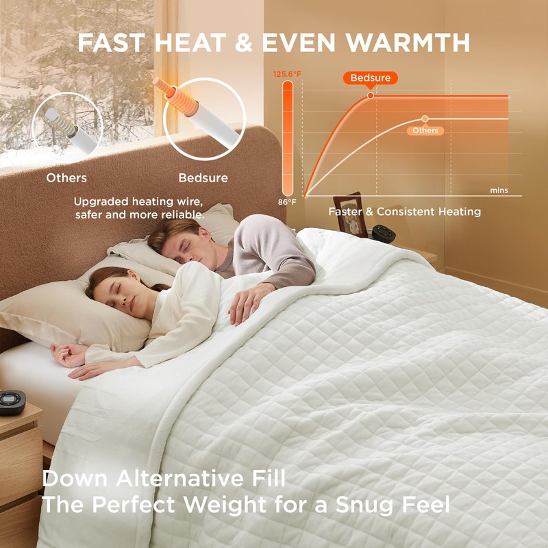 - Safer & More Reliable: Conducted in Bedsure Intertek-Recognized Satellite Lab, 74 safety tests with standards surpassing UL ensure safer performance. This heated blanket queen is ETL certified, and its default 8-hour auto shut-off prevents it from overheating so that you can enjoy warmth with complete peace of mind.