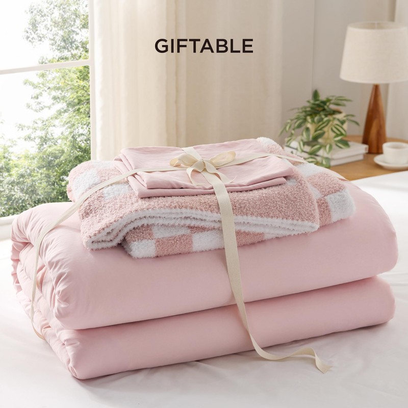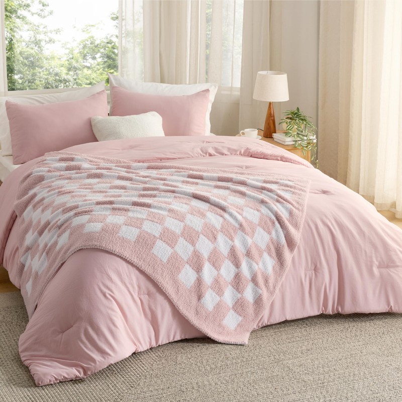 Bedsure King Comforter Set with Checkered Throw Blanket for Couch - 4 Pieces, 1 Pink Comforter King Size, 2 Pillow Shams, 1 Checkered Blanket, Super Soft, Lightweight & Fluffy for Bed & Sofa