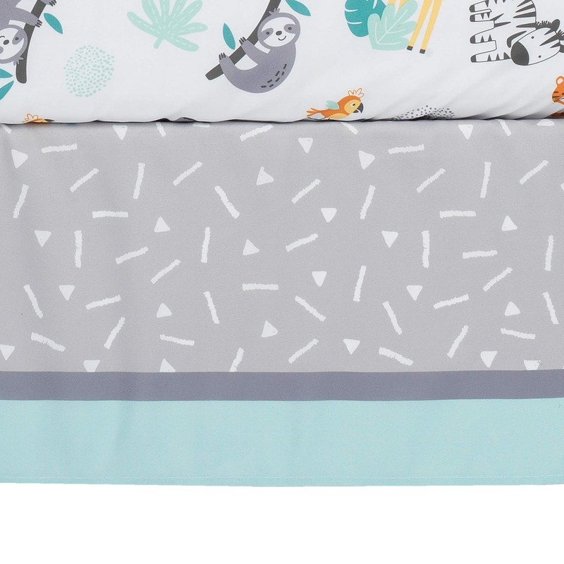 This jungle-themed 3-piece baby crib bedding set includes one quilt (35" X 44") one fitted crib Sheet and one coordinating Crib skirt all made in a soft to the touch microfiber fabric. ly jungle animals include a gray velour elephant with dimensional paws, a striped tiger, yellow giraffe, Sweet zebra, and happy Sloth. A white ground fitted Crib Sheet features a menagerie of Happy jungle animals and fits a standard size crib mattress measuring 52" X 28". The sheet has elastic all around for a safe and secure fit. Complete this collection with the coordinating Crib skirt. It is a gray and white Geo print with a dusty aqua border which is separated by a gray flange. The crib skirt has a 10" Drop.