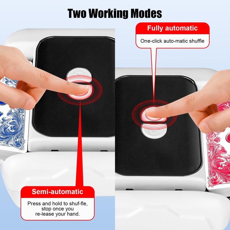 • Two Working Modes: Fully Automatic: One-click button for effortless, automatic shuffling. The built-in smart sensor detects cards and accurately stops when shuffling is completed, unlike older models that require holding the button until shuffling is done. Semi-Automatic: Press and hold to shuffle, stops when you release for more control.(Fully automatic and semi-automatic are different buttons)